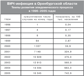 Развитие эпидемии ВИЧ-инфекции в Оренбургской области, как и в целом по Российской Федерации, определяется уровнем наркотизации населения, скоростью распространения наркотиков в молодежной, юношеской и даже детской среде, степенью доступности наркотиков.Доминирующим фактором распространения ВИЧ-инфекции в области остается парентеральное введение психоактивных веществ вне лечебно-профилактических учреждений, но его доля с течением времени снижается. Явная тенденция – увеличение числа лиц, заразившихся половым путем: в 2000 году при введении наркотиков заразилось 92% пациентов, в 2005-м – 40,7 %; происходит активизация полового пути передачи. В эпидемический процесс закономерно вовлекаются половые партнеры наркоманов. Как результат – изменение половой структуры ЛЖВС. В 2000 году соотношение полов составляло 1:15 в пользу мужчин, а в 2002–2005 годах женщин становится значительно больше, и соотношение выглядит как 1:2 в пользу мужчин.